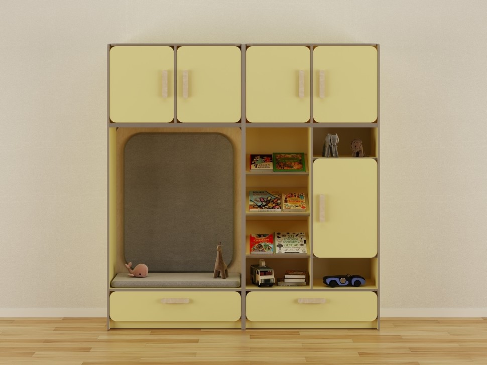 Детская стенка с местом для хранения и прямоугольной зоной отдыха — это многофункциональное решение, созданное специально для детских садов и дошкольных учебных заведений. Она помогает преобразовать пространство группы, делая его более организованным, нас
