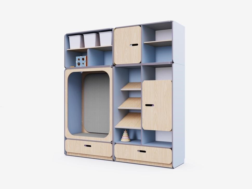 Модульные секции с полками для учебных материалов и развивающих игр.Встроенные шкафы с дверцами для безопасного хранения игрушек и пособий.