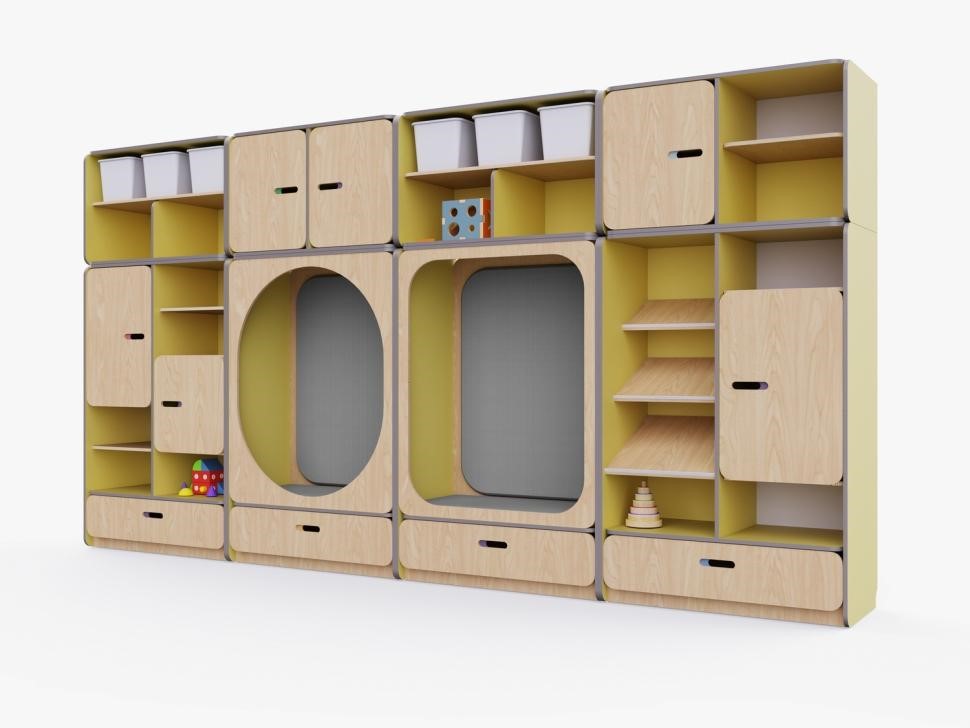 Встроенные шкафы с дверцами: обеспечивают сохранность игрушек и материалов, защищая их от пыли.