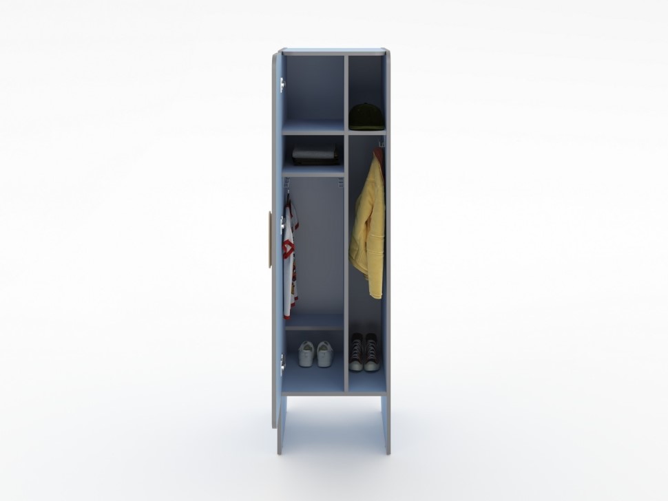 Детский шкаф-кабинка для хранения вещей и игрушек. Он разделён на две функциональные зоны: открытую - для верхней одежды, чтобы просушить её после прогулки в сырую погоду, и закрытую - для сменной одежды и обуви. Снизу шкафа идёт выдвижная скамейка. Предм