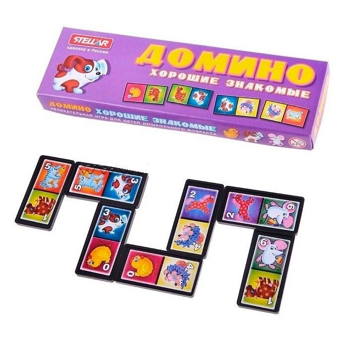 Домино - это веселая настольная игра для дружной компании. Игра состоит из пластмассовых карточек. На лицевую сторону нанесено изображение животных и цифры. Играя в домино, ребенок сможет получить представление о внешнем виде различных зверей, познакомится с цифрами, будет тренировать логику и мышление. Изображения красочно и качественно напечатаны. Каждый игрок должен добавить в цепочку из фишек одну их своих фишек так, чтобы изображение на ней подошло к изображению на конце цепи. Если в руках у игрока нет подходящей фишки, он берет дополнительные до тех пор, пока не попадется нужная. Выигрывает тот, кто первым выложит все свои фишки.