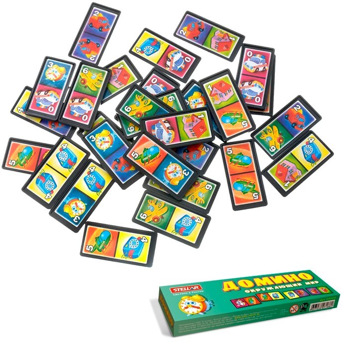 Домино - это веселая настольная игра для дружной компании. Игра состоит из пластмассовых карточек. На лицевую сторону нанесено изображение предметов окружающего мира и цифры. Играя в домино, ребенок сможет получить представление об окружающем мире, познакомится с цифрами, будет тренировать логику и мышление. Изображения красочно и качественно напечатаны. Каждый игрок должен добавить в цепочку из фишек одну их своих фишек так, чтобы изображение на ней подошло к изображению на конце цепи. Если в руках у игрока нет подходящей фишки, он берет дополнительные до тех пор, пока не попадется нужная. Выигрывает тот, кто первым выложит все свои фишки.