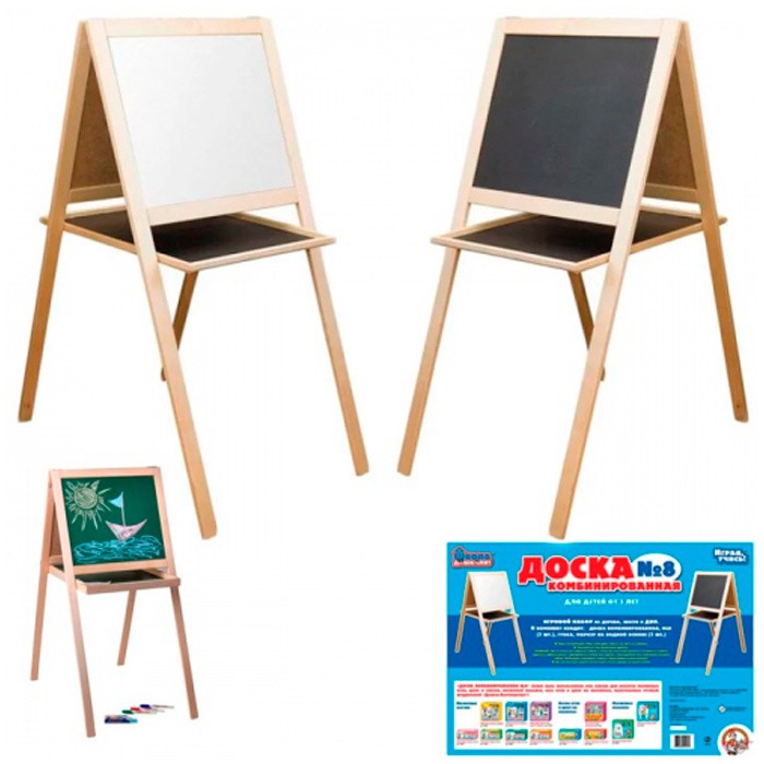 Комплектация: маркер 3 шт.; мел 3 шт.; доска мольберт напольная, магнитная 1 шт; салфетка, 1 шт.