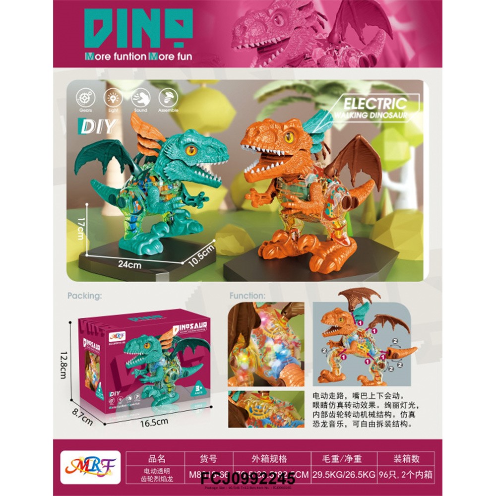 У дракона подвижные лапы, ходит, рычит, мигают цветные огоньки. Корпус прозрачный, видно, как при движении внутри крутятся цветные шестеренки.