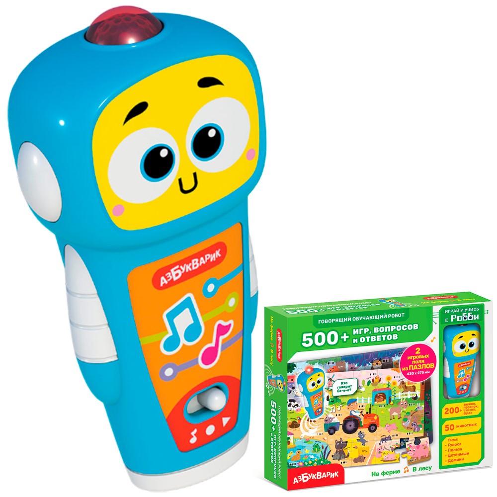 В наборе - говорящий робот со сканером штрихкодов и 2 пазла из 24 и 35 элементов; 50 животных, более 500 игр, вопросов и ответов.