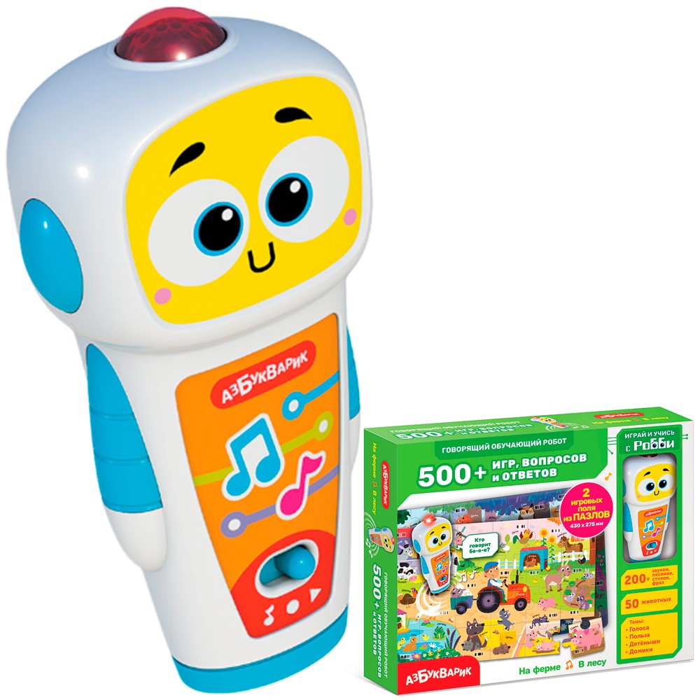 В наборе - говорящий робот со сканером штрихкодов и 2 пазла из 24 и 35 элементов; 50 животных, более 500 игр, вопросов и ответов.