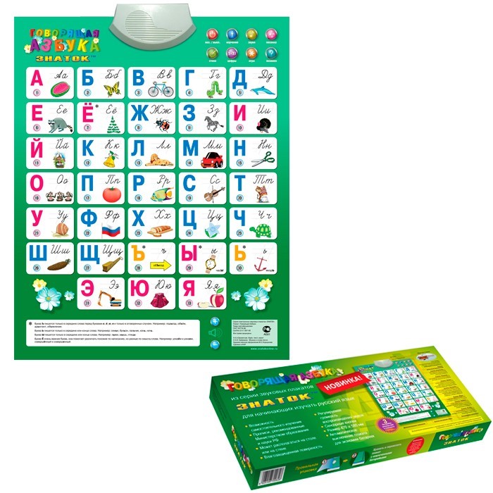 В говорящей азбуке из серии звуковых плакатов "ЗНАТОК " с новыми функциями учтены пожелания педагогов и родителей.
