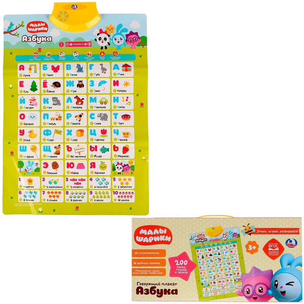 Плакат познакомит малышей с буквами русского алфавита, цифрами и счетом, поможет разучить стихи и песенки. Он представляет собой наглядное пособие для детей. Яркое изделие содержит кнопки, нажав на которые можно услышать звуки, мелодии, слова. Плакат наглядно демонстрирует материал. Развивает память и пространственное мышление ребенка, знакомит его с окружающим миром. Он поможет ярко, весело, а главное, наглядно показать информацию.