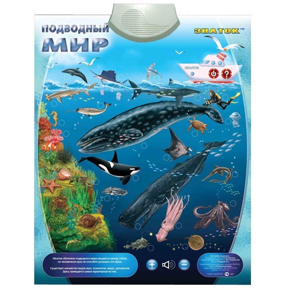 На плакате изображены морские обитатели: осьминог, акула, дельфин, кальмар и другие. Возле каждого животного находится кнопка, нажав на которую, ребёнок сможет послушать информацию о морском обитателе и услышать, какие звуки он издаёт.