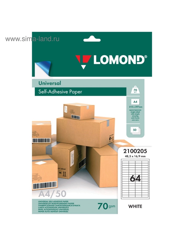 Этикетка самоклеящаяся LOMOND, на листе формата А4 64 этикетки 48,5х16,9 мм, 50 листов, белая матовая (2100205)