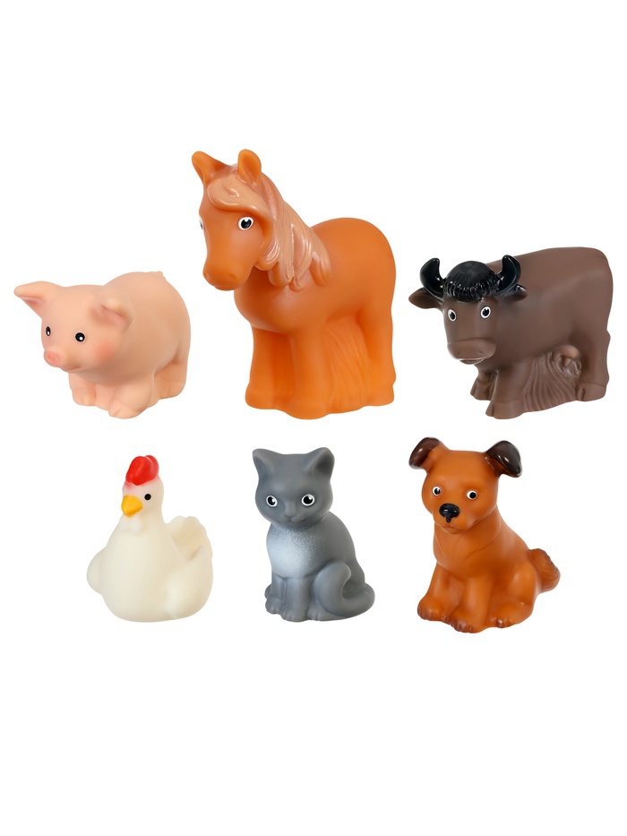 «Домашние животные» — набор игрушек из ПВХ. В наборе представлено шесть различных игрушек, включающих лошадь, свинью, корову, собаку, кошку и курицу. Размер набора в упаковке составляет 21 см, что делает его удобным для игры дома, в машине или во время отдыха на природе.
