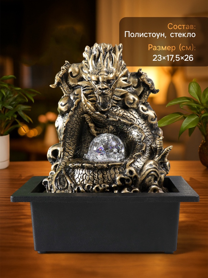 Древняя мудрость и сила в вашем пространстве! Настольный фонтан «Золотой Дракон» — это не просто декоративный элемент, а работающий арт-объект для создания особой атмосферы. Компактный размер делает его идеальным акцентом для рабочего стола, домашнего кабинета или зоны отдыха.