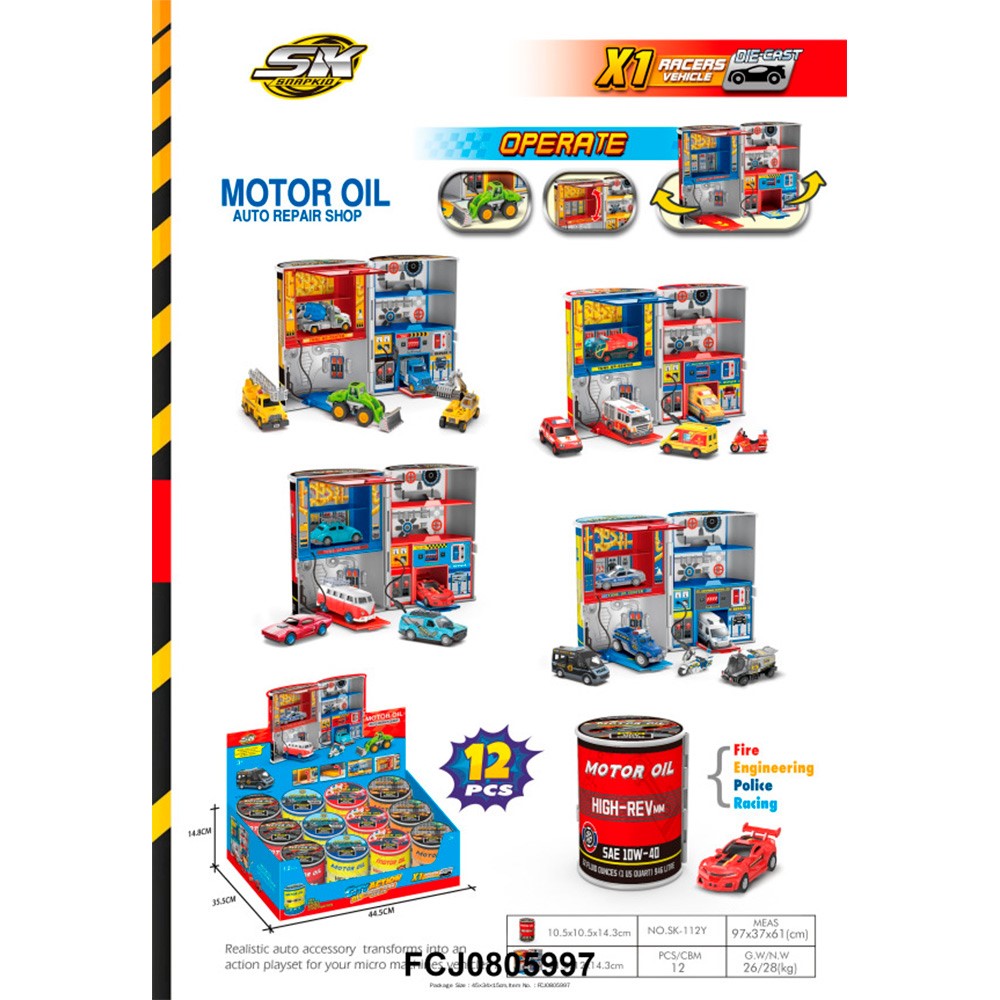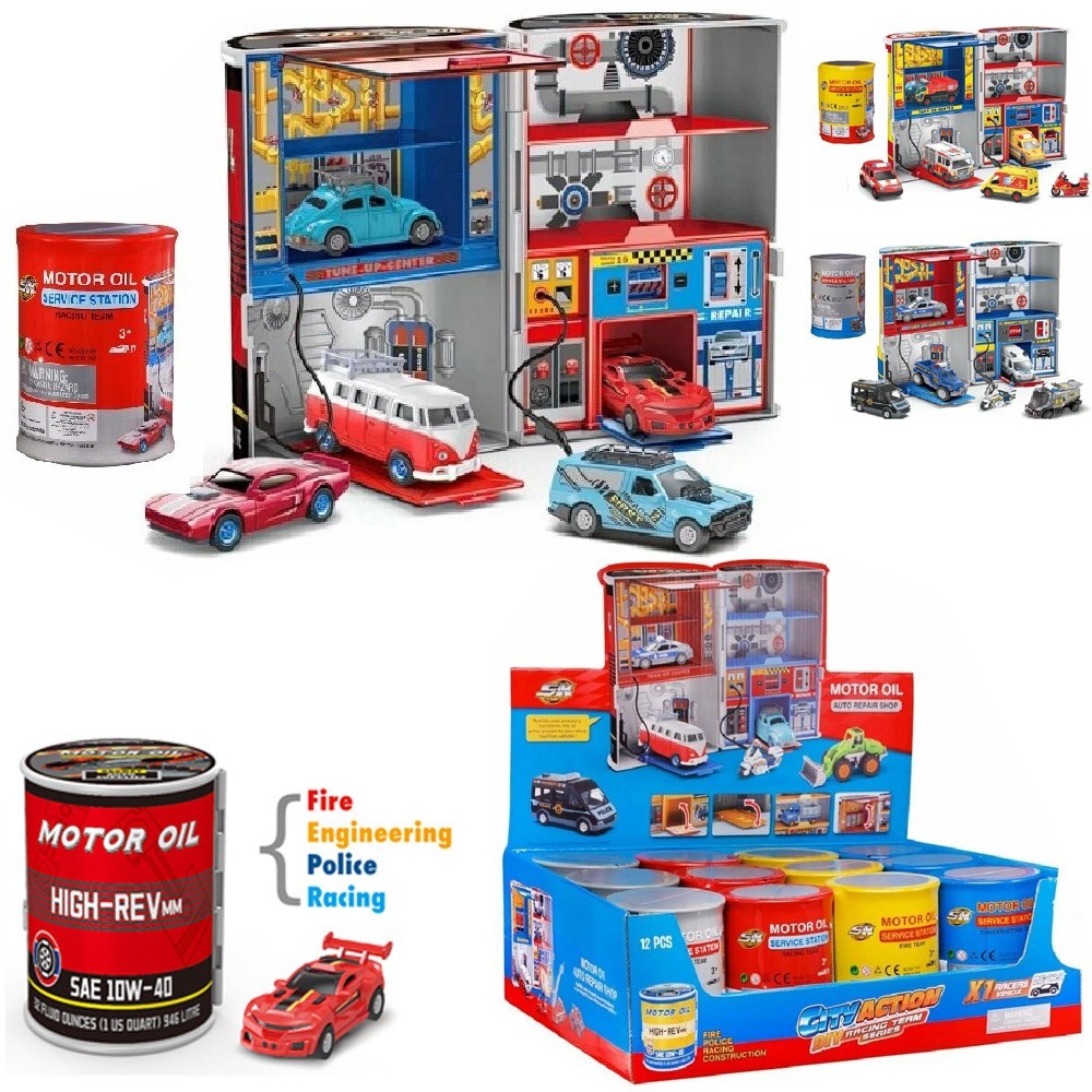 Миниатюрный гараж представляет собой пластиковый цилиндр, который раскрывается и превращается в полноценную станцию по обслуживанию автомобилей.
