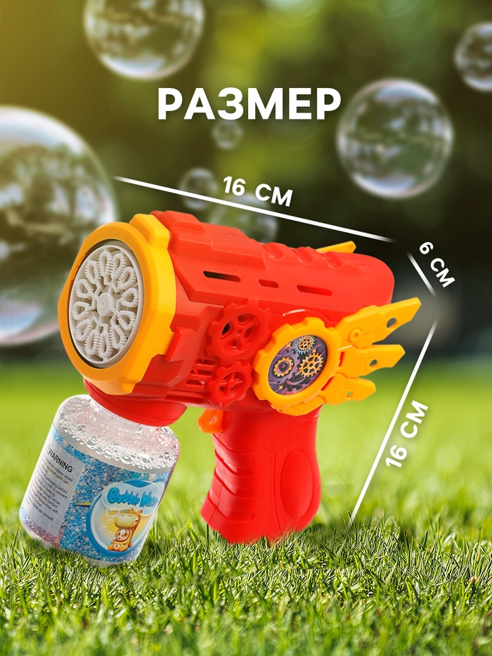 - Эргономичная форма бластера: удобно лежит в детской руке — можно легко направлять поток пузырей в нужную сторону.