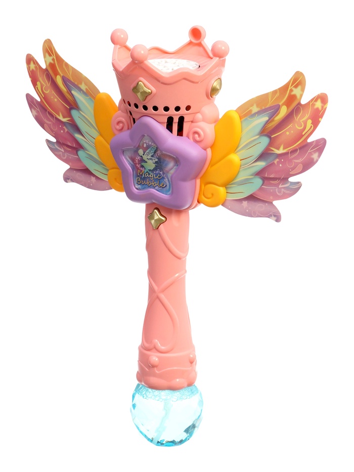 - Дизайн с крыльями феи: изящная форма с декоративными крылышками удобно лежит в детской руке — можно легко направлять поток пузырей.