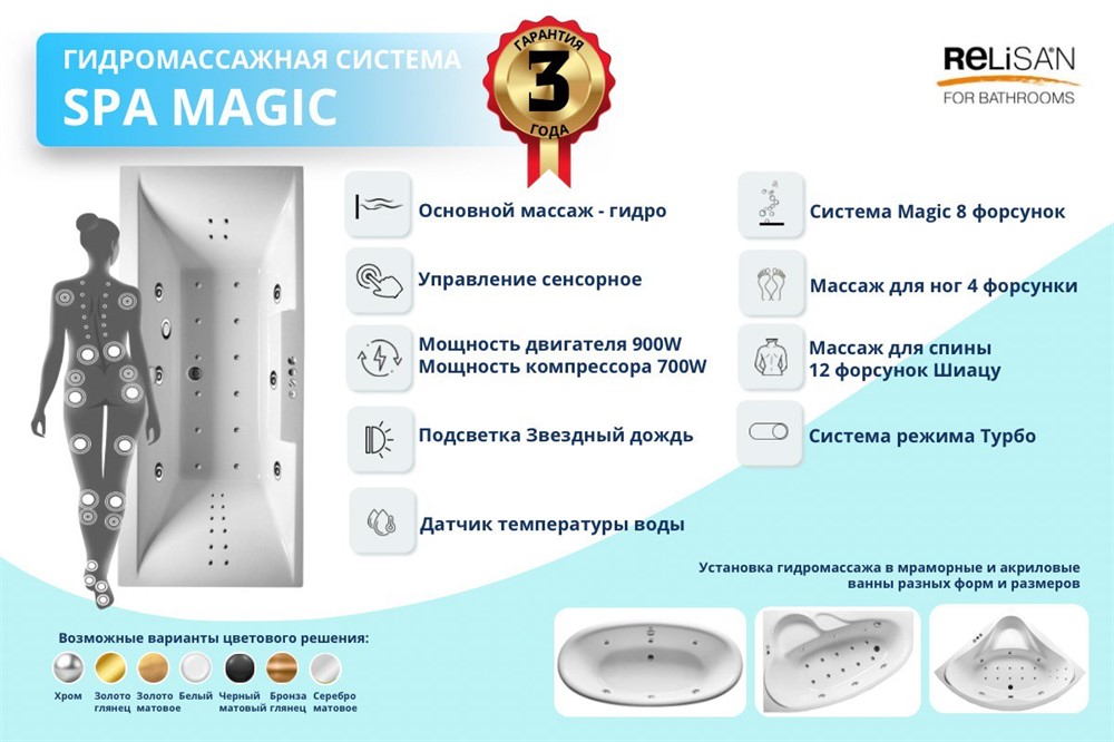 SPA Magic — это премиальная гидромассажная система нового поколения, объединяющая в себе все достижения Relisan в области гидромассажа, аэромассажа и светотерапии. Врезается в ванны из акрила или литьевого мрамора. Система не поставляется отдельно и интегрируется в изделие под заводским контролем качества. При установке гидромассажной ванны обязательно ознакомьтесь с инструкцией.