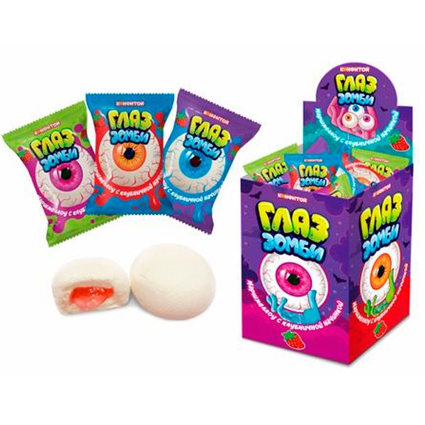 - три разных цвета упаковки - три разных глаза, внутри которых скрывается белый воздушный зефир с яркой клубничной начинкой;