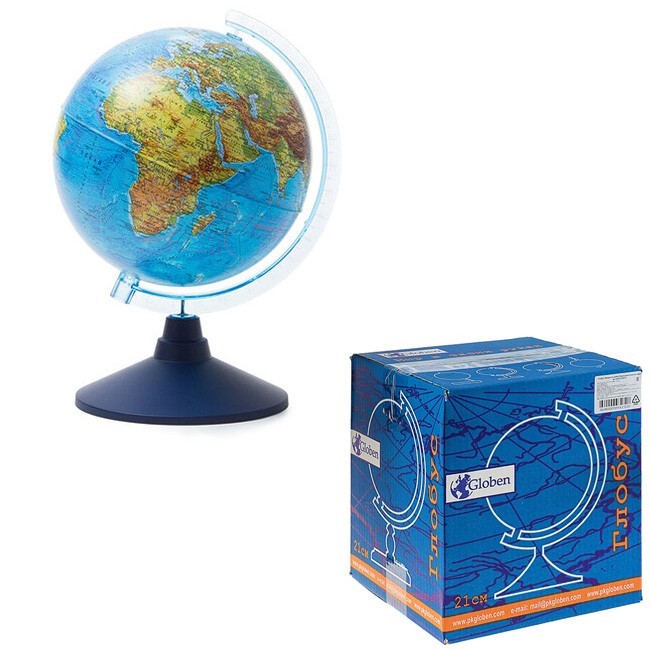 Макет глобуса Земли от компании "Глобен" с картой мира - эффектное и практичное дополнение к ученическому рабочему месту. Глобус отличает качественная полиграфия, приятная цветовая гамма и детальная прорисовка рельефов. Макет Земного шара, традиционно наклоненный под углом 70° и закрепленный на устойчивой пластиковой подставке, впишется в любой уголок интерьера.