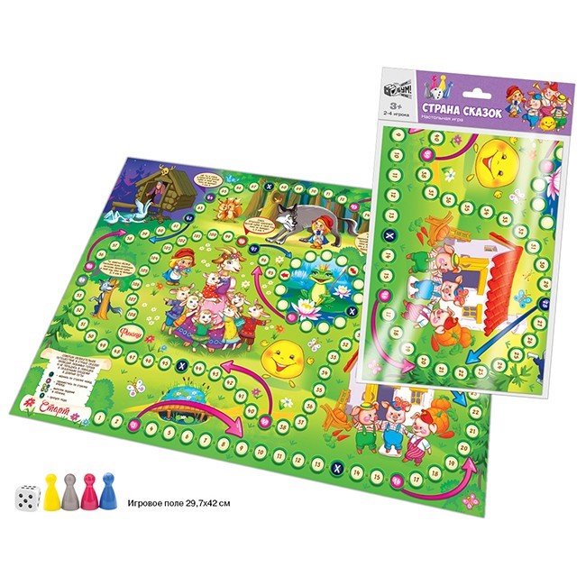 Красочная и яркая игра-ходилка с веселыми заданиями и героями любимых сказок - прекрасный способ весело и с пользой провести время с друзьями и в кругу семьи. Красивые иллюстрации привлекут внимание ребенка. Оригинальная настольнгая игра поможет весело и интересно провести время. В процессе игры дети смогут научиться считать - в этом им поможет игральный кубик и перемещение по игровому полю. Количество ходов определяет кубик, который нужно бросать по очереди. Все элементы игры выполнены из качественных и прочных материалов, окрашены безопасными нетоксичными красками, устойчивыми к износу и выгоранию. Такие игры прекрасно развивают цветовое восприятие, внимание, усидчивость,