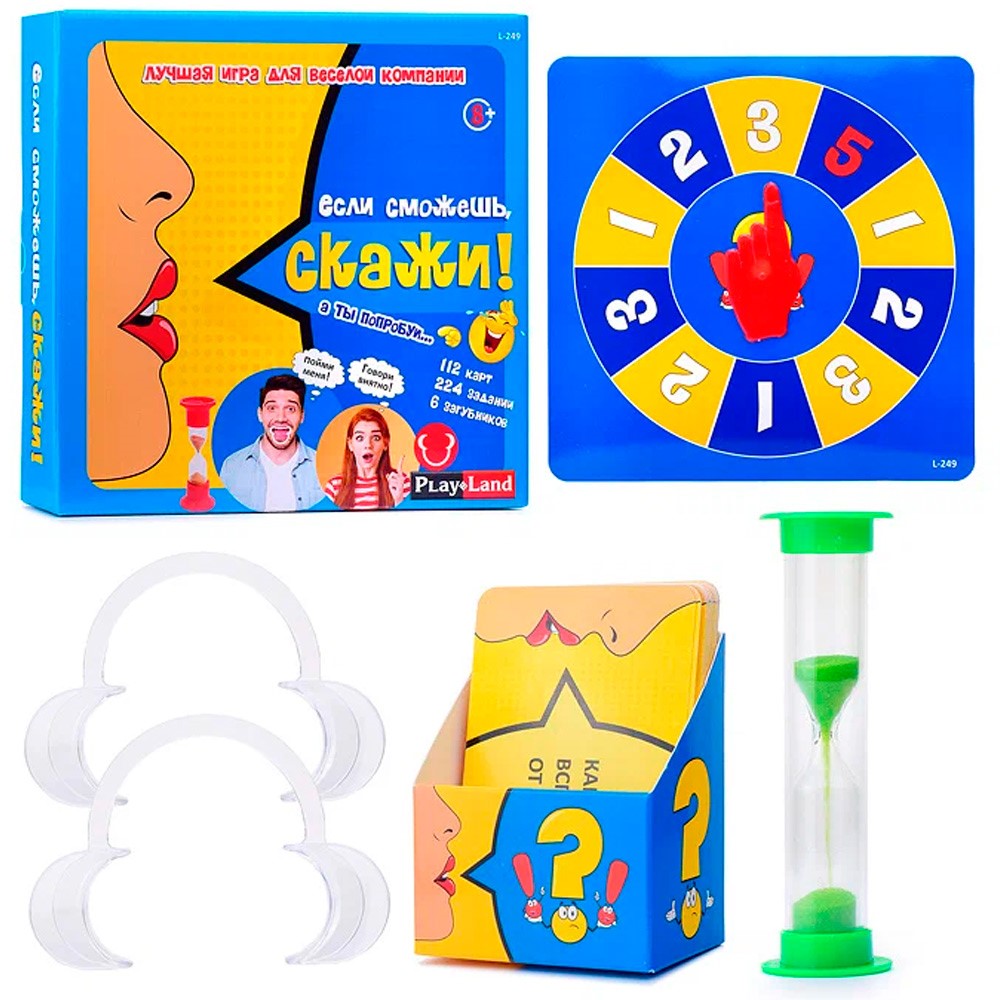 Комплектация: загубники (расширители для рта) – 6 шт., двухсторонние карточки – 112 шт., песочные часы на 15 секунд – 1 шт., поле-рулетка – 1 шт., палец-указатель – 1 шт., картодержатель – 1 шт.