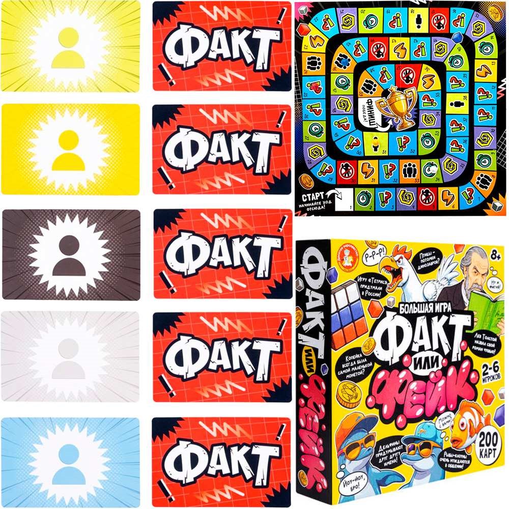 Комплектация: игровое поле - 1 шт., фишка - 6 шт., карты "факт-фейк" - 64 шт., карты "быстрее молнии" - 50 шт., карты "было-не было" - 34 шт., карты "блиц" - 40 шт., карты голосования - 12 шт.. правила