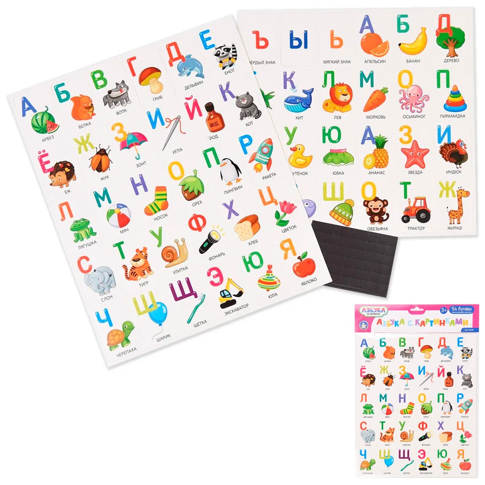 Комплектация: карточка с буквами - 54 шт., самоклеющиеся магниты – 54 шт.