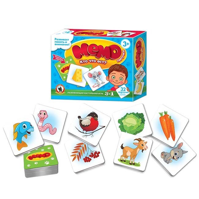 Игра-мемо прекрасно развивает зрительное восприятие и память: нужно перемешать выложить карточки рядами рубашкой вверх. игроки по очереди переворачивают по две картоки - если картинки совпали, то игро забирает карточки себе, если нет, то игрокам нужно запомнить, что на них изображено и где они лежат, чтобы использовать это наблюдение в свой ход. Побеждает тот, кто соберет больше всех пар карточек.