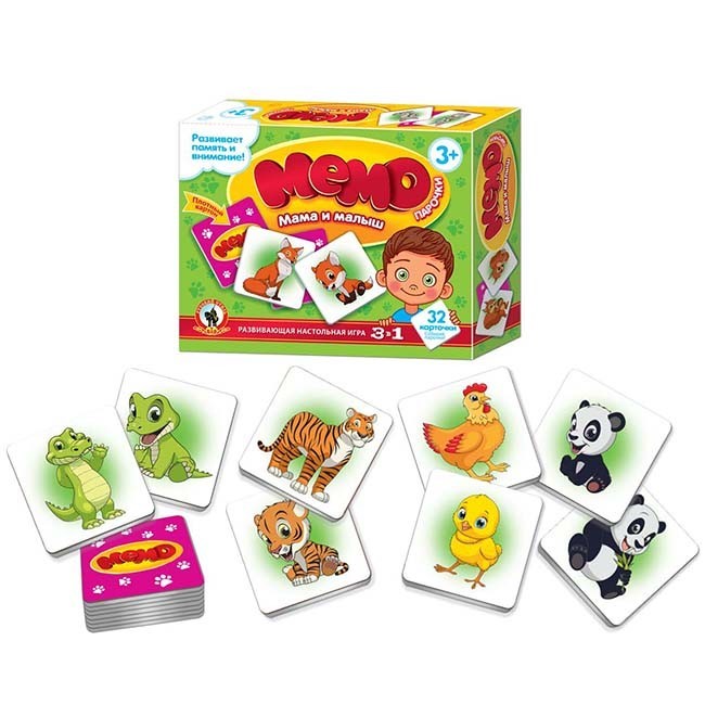 Игра-мемо прекрасно развивает зрительное восприятие и память: нужно перемешать выложить карточки рядами рубашкой вверх. игроки по очереди переворачивают по две картоки - если картинки совпали, то игро забирает карточки себе, если нет, то игрокам нужно запомнить, что на них изображено и где они лежат, чтобы использовать это наблюдение в свой ход. Побеждает тот, кто соберет больше