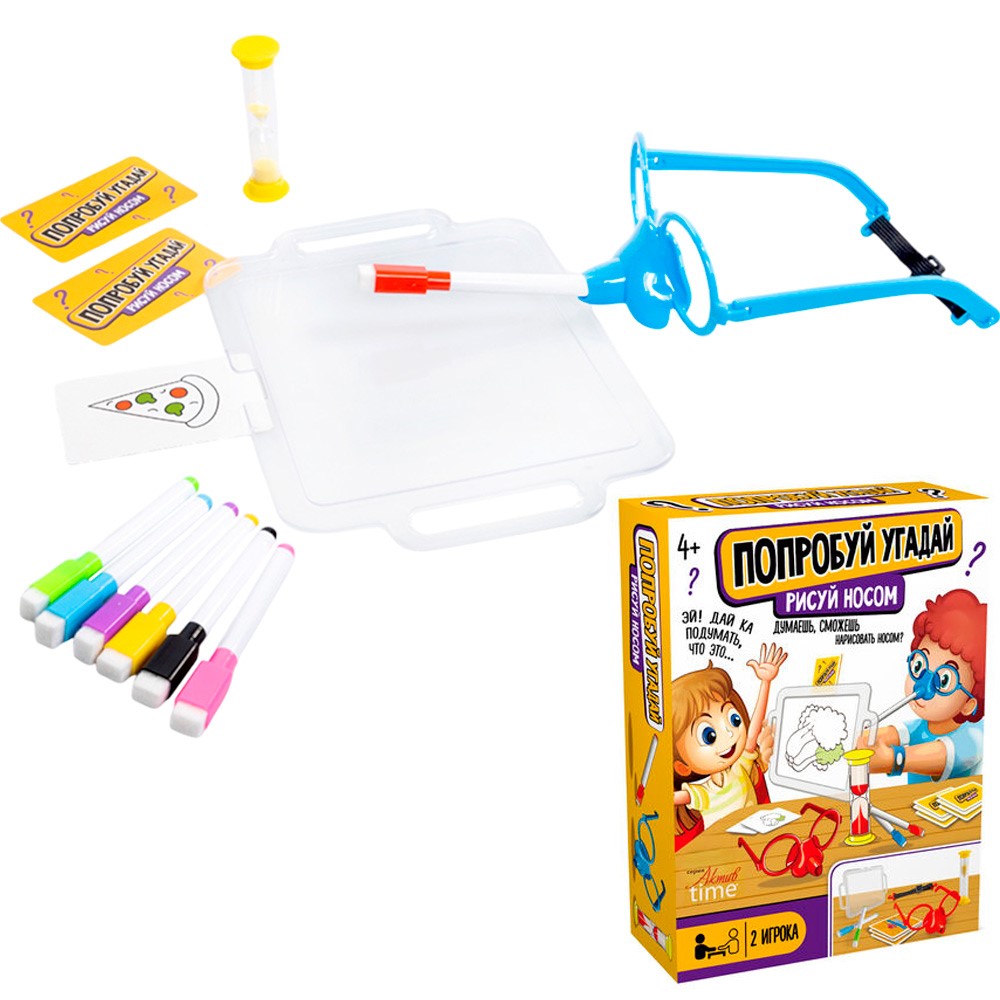 Комплектация: маска - 2 шт., заушники (длина 13 см) - 4 шт., резинка-держатель - 2 шт., цветные маркеры на водной основе - 8 шт., песочные часы - 1 шт., карты с заданиями - 54 шт., доска для рисования - 1 шт.