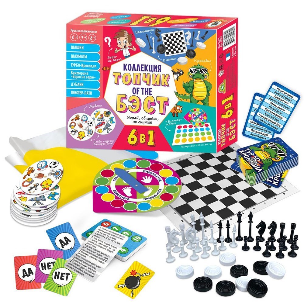 6 игр в наборе: викторина "Верю - не верю", шашки и шахматы, Твистер, Дублик, Крокодил.