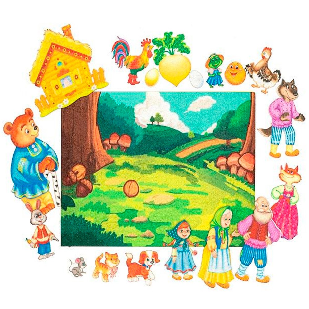 Комплектация: 19 фигурок к 5 русским народным сказкам («Колобок», «Теремок», «Репка», «Заюшкина избушка», «Маша и медведь»), игровое поле с карманом (20 х 30 см)