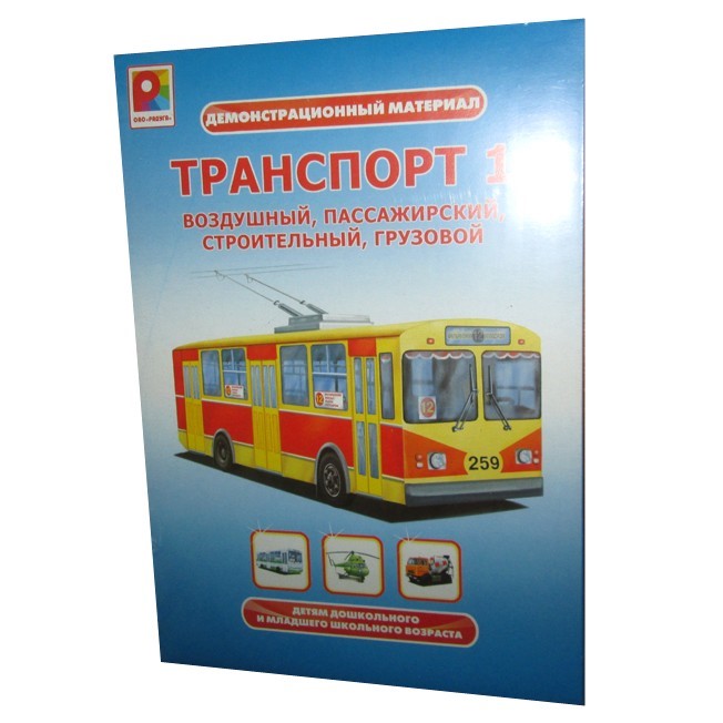 Демонстрационный материал "Транспорт 1" состоит из 4 сюжетных карт, относящихся к воздушному, пассажирскому, строительному и грузовому транспорту, 12 карт с видами транспорта (по 3 карточки на каждый сюжет), 4-х карточек с надписями и жетонами для поощрения детей, 12 листов раскраски с крупными изображениями. Материал может использоваться как для индивидуальных, так и для групповых занятий с детьми.