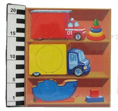 В набор входят карточки-рамки с красочными иллюстрациями. Малыш должен подобрать недостающие элементы картинки и вставить их в специальные выемки.