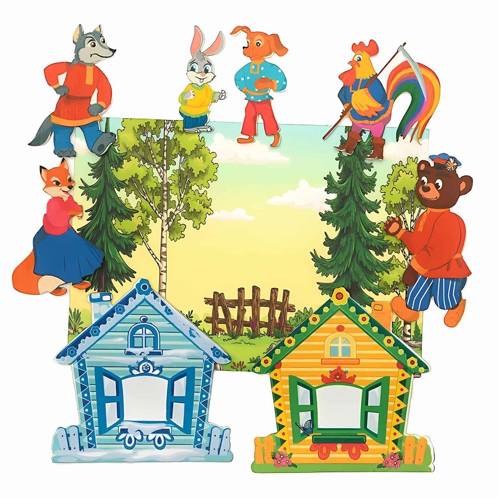 Комплектация: игровое поле - 1 шт., медведь - 1 шт., собака - 1 шт., петух - 1 шт., заяц - 1 шт., лиса - 1 шт., волк - 1 шт., избушка - 2 шт.