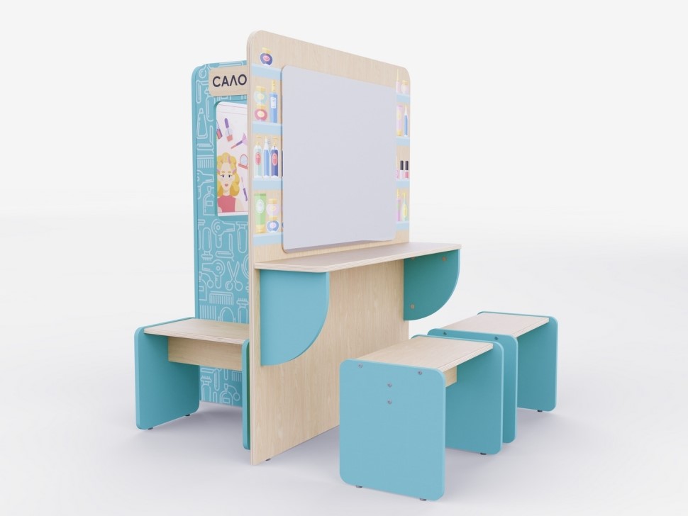 Описание и комплектация для прайсаПространство для сюжетно-ролевых игр в детских садах и дошкольных учреждениях, чтобы дети могли в приближенном к реальности пространстве попробовать себя в роли стилистов, визажистов, парикмахеров и клиентов салона красоты