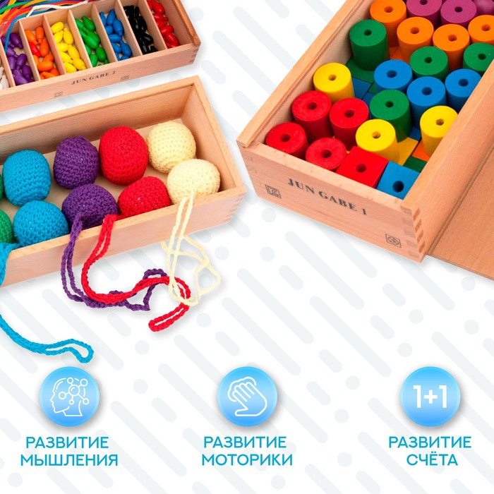 В комплекте есть верёвочки, бусины, деревянные блоки разных форм, колечки, палочки.