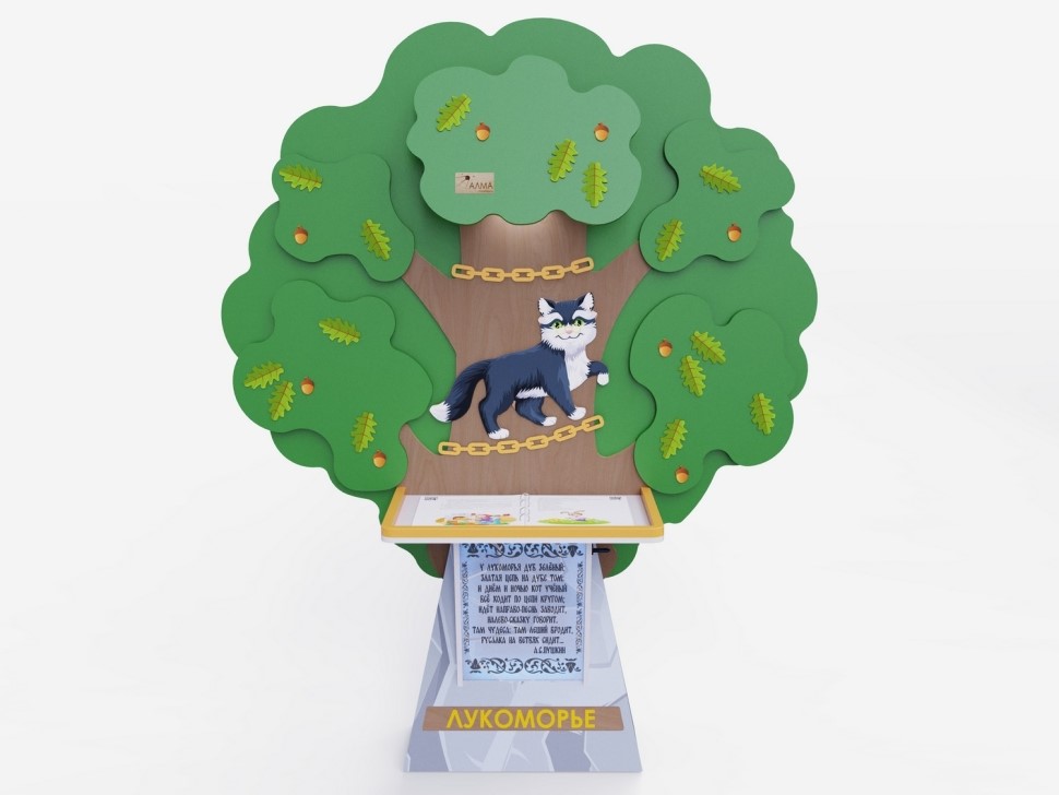 Стойка сконструирована из экологичных и гипоаллергенных материалов, гарантирует безопасность и долговечность даже в условиях интенсивного использования. Дизайн стойки выполнен в узнаваемом виде сказочного дуба, вокруг которого по цепи ходит кот. Дополнен цитатой из поэмы «Руслан и Людмила» А.С. Пушкина «У лукоморья дуб зеленый...».