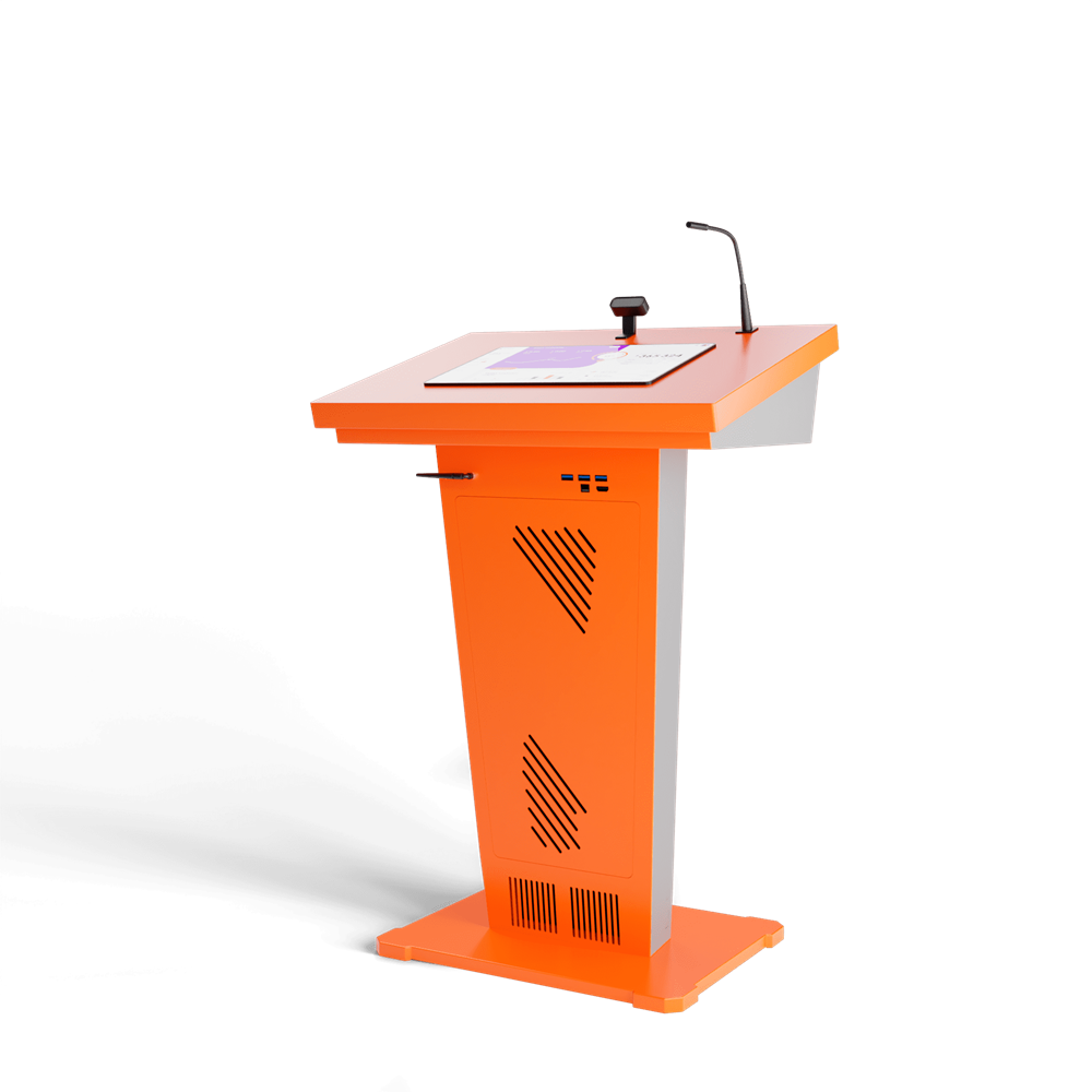 Эта интерактивная трибуна удивляет своим футуристическим и запоминающимся дизайном, а также имеет передовую техническую начинку. В ней предусмотрены все необходимые элементы для успешных выступлений: микрофоны, колонки, усилитель звука, разъемы для подключения оборудования. Также она оснащена большим сенсорным дисплеем и возможностью вывода информации на большой экран.