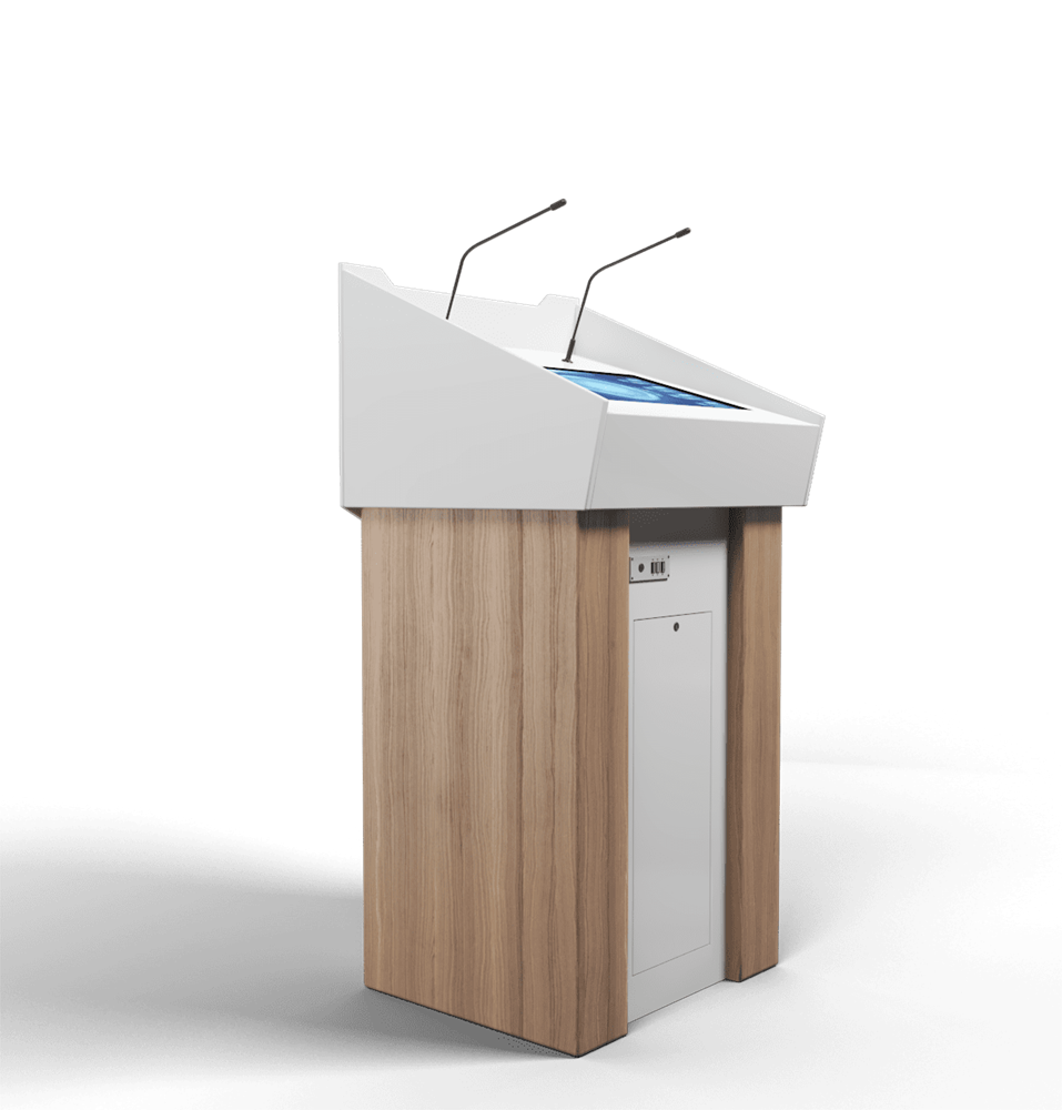 Отличное решение для конференц-залов, лекториев и аудиторий, а также для любых пространств, где предполагаются публичные выступления. Современный, минималистичный и стильный дизайн позволит трибуне вписаться в любой интерьер, а ее мультимедийные возможности обеспечиваются дисплеем с технологией мультитач, микрофоном и оболочкой Aura, которая поддерживает офисные приложения и программы для презентаций.