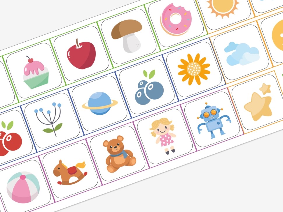 Яркие и четкие изображения — от знакомых детям игрушек и сладостей до видов транспорта и космических объектов — создают позитивную атмосферу и стимулируют интерес малышей к окружающему миру.
