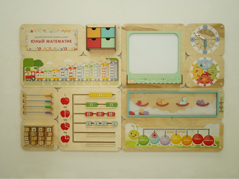 Дидактическая панель «Юный математик» разработана методистами, дизайнерами и конструкторами компании АЛМА для создания развивающей предметно-пространственной среды, формирования интереса к математике, познавательного развития детей, а также для оформления стен детского сада.
