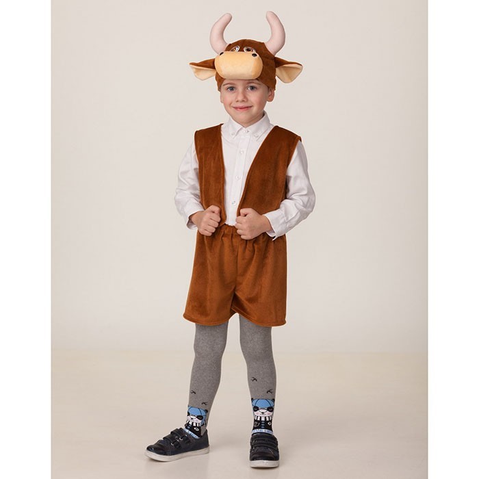 Компания "Батик" предоставляет обширный ассортимент нарядов для различных случаев: утренники в детском саду, карнавалы, балы-маскарады, театрализованное представление. Костюм бычка довольно реалистичен, он задаст настроение и вызовет улыбки. Забавный новогодний костюм понравится подвижным малышам. Он удобен, не сковывает движений и приятен на ощупь. Наряд сшит из мягкого плюша. Дополнит образ оригинальная шапочка-маска.