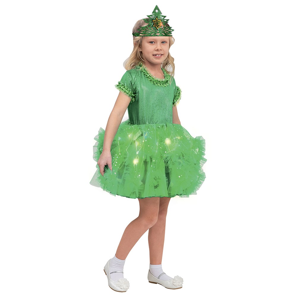 Очаровательное пышное платье со светодиодами и красивая корона в виде ёлочки понравится каждой юной красавицы.