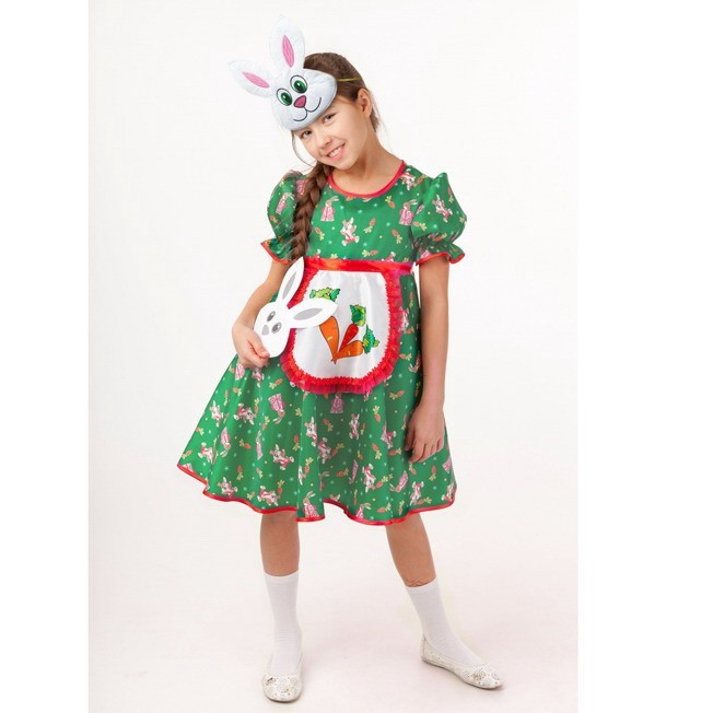 Если вашему ребенку досталась роль зайчика-девочки на детском утреннике, то для этой роли отлично подойдет карнавальный костюм Зайка Аня 1009 к-18-30 от компании "Пуговка", ведь это и нарядный костюм, и яркий образ на детский утренник и на выступление. Платье насыщенного зеленого цвета с неброским принтом и классического кроя с рукавами-фонариками подойдет и для других торжеств. Оно декорировано красной тесьмой. Костюм может использоваться и для театрализованного выступления. Дополняют образ шапочка-маска и озорной передник. При пошиве используются яркие плотные натуральные смесовые ткани - стойкие к истриранию, не мнутся.