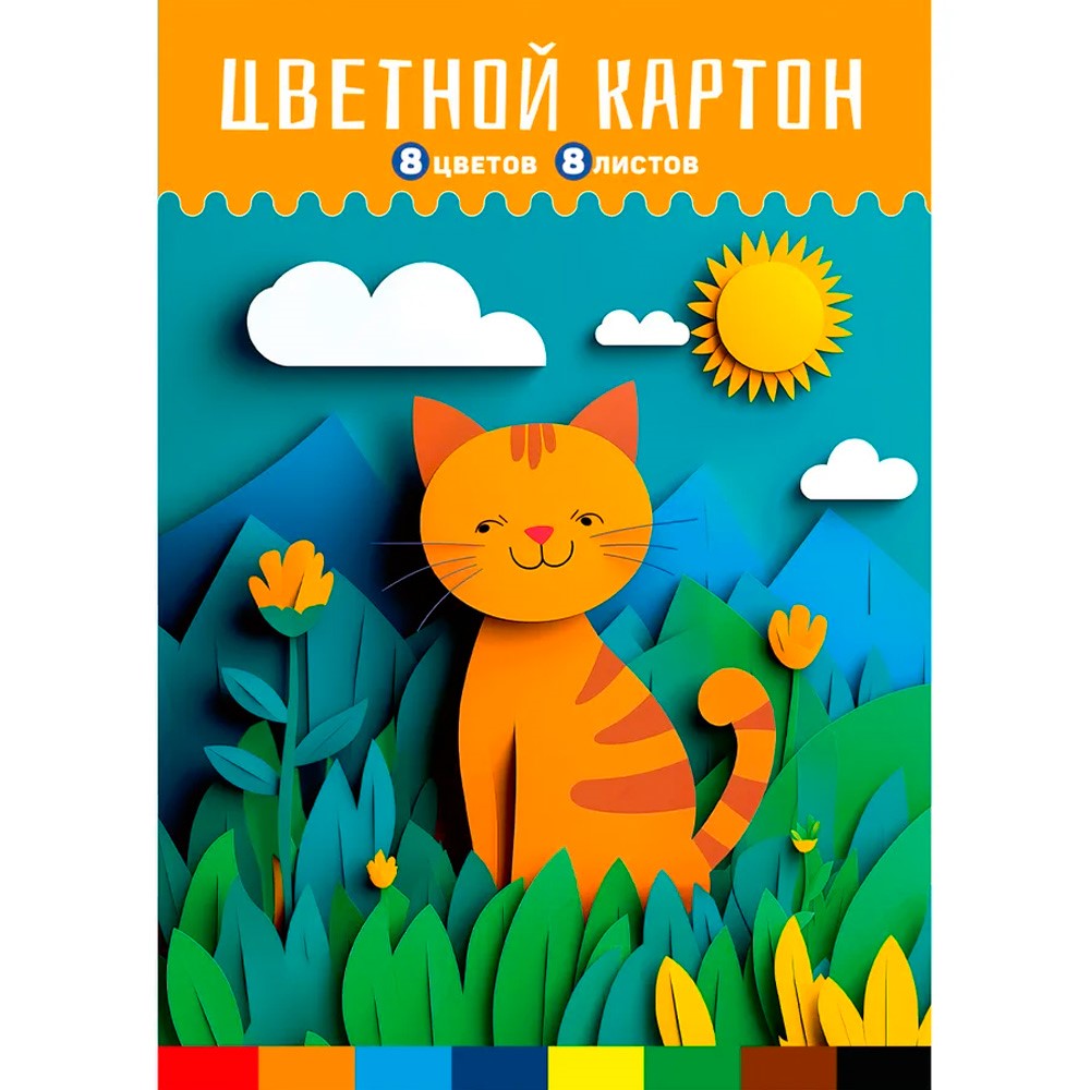 Картон цветной 8 л. 8 цв. Рыжий кот на траве 08-8399