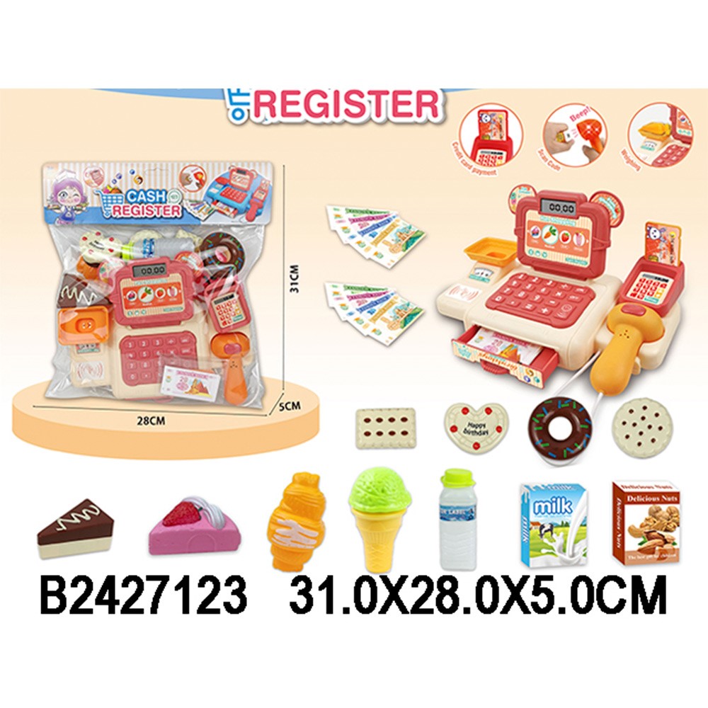 - в комплект входит касса со сканером, деньги, кредитная карта, игровые атрибуты;