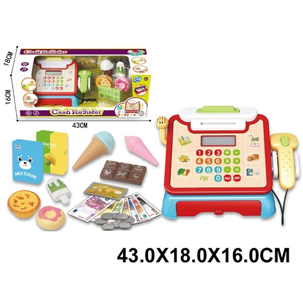 - в комплект входит касса со сканером, деньги, кредитная карта, игровые атрибуты