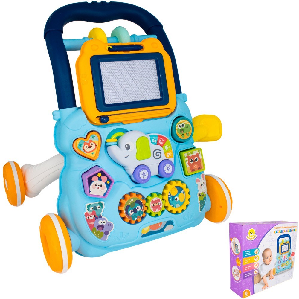 Комплектация: каталка-ходунки (состоит из 15 деталей) – 1 шт., лист со стикерами, которые клеятся на развивающиеся аксессуары – 1 шт.