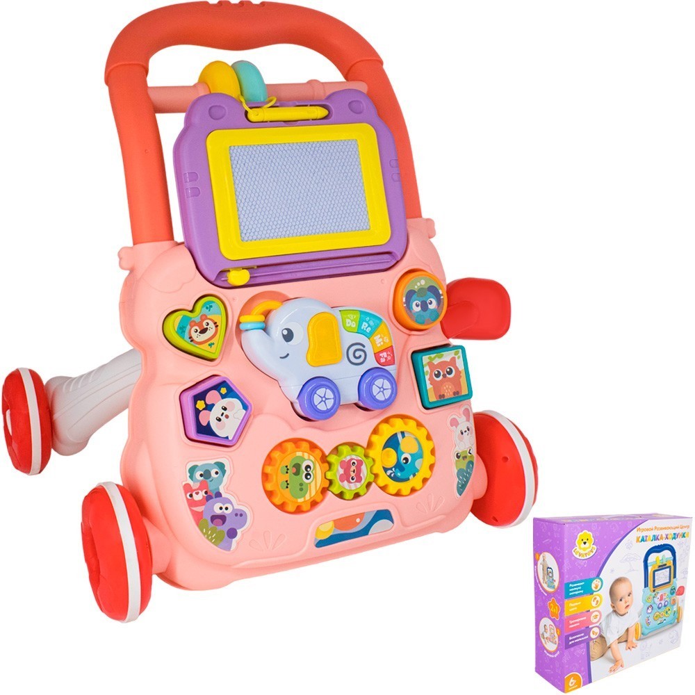 Комплектация: каталка-ходунки (состоит из 15 деталей) – 1 шт., лист со стикерами, которые клеятся на развивающиеся аксессуары – 1 шт.