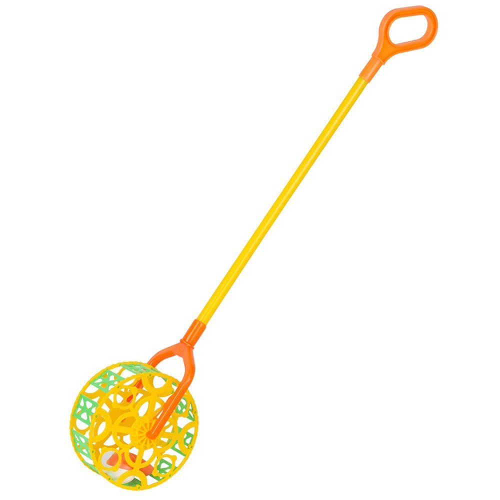 Игрушка каталка «Погремушка» изготовлена в виде барабана с шариками внутри и ручки. При движении шарики перекатываются и дополнительно слышен звук трещотки. Каталка предназначена для использования на улице и в помещении. Развивает физическую форму и координацию движения.